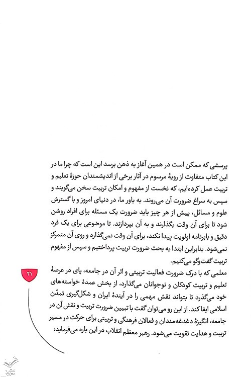 اندیشمندان مسلمان، از زاویۀ نگاه خود به کلام معصومین و آیات قرآن نگریسته‌اند. و سعی کرده‌اند تا مسائل روز جامعه اسلامی را با نگاه تربیتی و با تمرکز بر دورۀ کودکی و نوجوانی پاسخ دهند. اما آنچه جایش خالی است و بسیار به چشم می آید. تحلیلی موشکافانه از نیازهای جامعه اسلامی و حرکت آن به سمت تمدن نوین اسلامی بود. آنچه دغدغه‌مندان عرصۀ تربیت را به سوی مطالعه، دقت، فهم، تفکر و تحقیق در دیدگاه‌های رهبر فرزانه انقلاب دربارۀ تربیت می‌کشاند، نگاه جامع ایشان به اتفاقات و مسائل است.