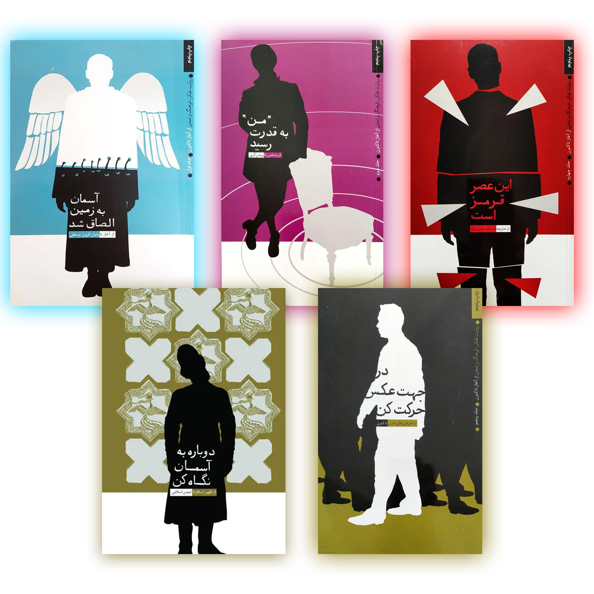 آسمان به زمین الصاق شد، دوباره به آسمان نگاه کن، من به قدرت رسید، این عصر قرمز است و در جهت عکس حرکت کن، عنوان کتاب های مجموعه پنج جلدی «روایت تفکر، فرهنگ و تمدن» است. این مجموعه می کوشد با روایت تاریخ، تحلیل و بررسی وقایع، به کشف روابط میان پدیده ها و کلیات بپردازد و برای ساده ترشدن نیل به این هدف، از عکس، طرح و جدول های گوناگون مدد می جوید.
