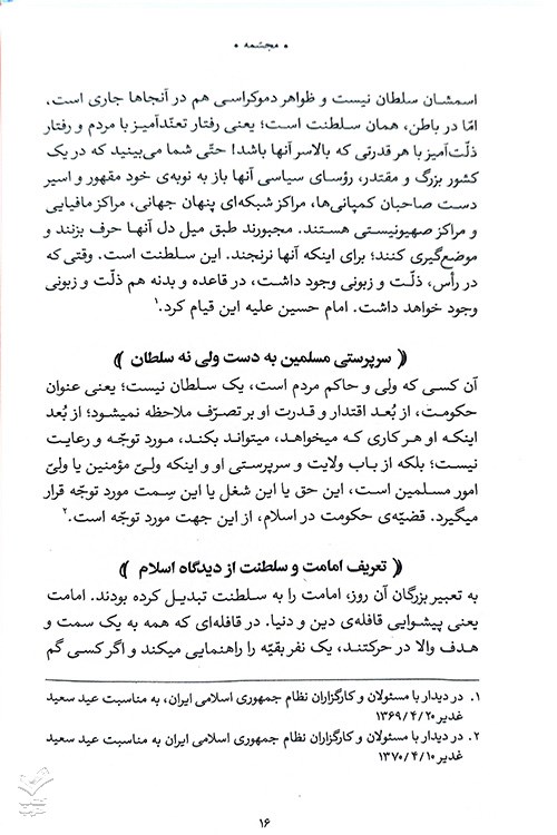 یکی از وجوه زندگی بشر در طول تاریخ، حیات اجتماعی و برقراری نظم و امنیت و اداره صحیح امور جامعه بوده است. همین امر او را به سوی تشکیل حکومت تشویق کرده است. بشر از ابتدای هبوط حضرت آدم (ع) گونه‌های مختلفی را برای حکومت تجربه کرده است: حکومت‌های الهی، حکومت‌های پادشاهی، حکومت‌های دموکراتیک و … اما آن‌چه که با نگاه به تاریخ به دست می‌آید، غلبه حکومت‌های پادشاهای در اقصا نقاط جهان است. هنوز هم در کشورهای مدعی تمدن این نظام دیده می‌شود. حکومت پادشاهی، حکومتی است که یک نفر تمام منابع کشور را در اختیار می‌گیرد و هرطور که بخواهد با جان و مال مردم رفتار می‌کند. شاه صاحب کشور است و همه مردم رعیت او. پس از انقلاب کبیر فرانسه بسیاری از حکومت‌های پادشاهی یا مجبور به پذیرش مجلس شورا شدند یا برای ظاهرسازی تن به مشروطه دادند. در تاریخ اسلام هم جز در دوره کوتاهی، حکومت به گونه پادشاهی اداره گردید. مهم‌ترین دشمن تاج و تخت پادشاهان، آگاهی و دین‌داری حقیقی مردم بود. از این روی بود که همیشه با این دو عنصر دشمن بودند. این امر در دو سلسله پایانی شاهنشاهی ایران سلسله‌های منحوس و بی‌کفایت قاجاریه و پهلوی پررنگتر بود. این کتاب بیانات رهبر معظم انقلاب حضرت آیت‌الله‌العظمی خامنه‌ای (مدظله‌العالی) درباره حکومت‌های پادشاهی ایران است و مانند راهنمایی تاریخ را برای علاقه‌مندان روشن می‌کند.